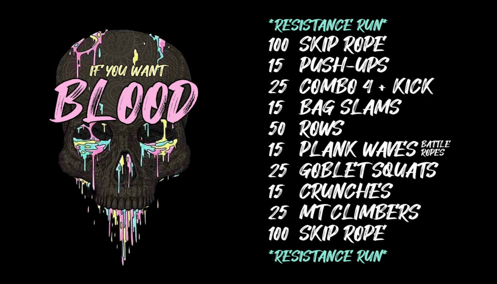The “If You Want Blood” WOD also features a second round of skip rope and resistance run to bring the intensity to the next level. The combination of cardio, strength, and endurance exercises will leave you feeling exhilarated, accomplished, and ready to conquer anything.